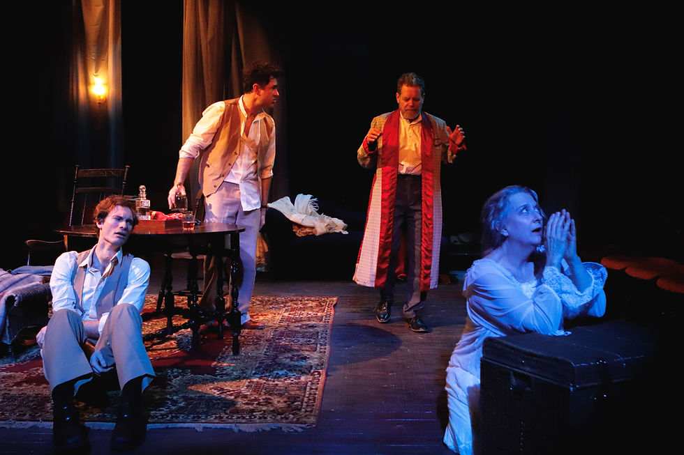 The distressed set is the genius design of Ian Hinz giving a feel of past elegance that has faded over time. Ian also designed the lighting that worked well to isolate. Rebecca Moseley supplied the many props needed to propel the story as well as was in charge of the sound design. The show was superbly co-directed by Rebecca Moseley and Ian Wolfgang Hinz who definitely stepped up to the challenge.